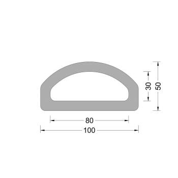 Rubber D fender profiel met een breedte van 100mm en een hoogte van 50mm.